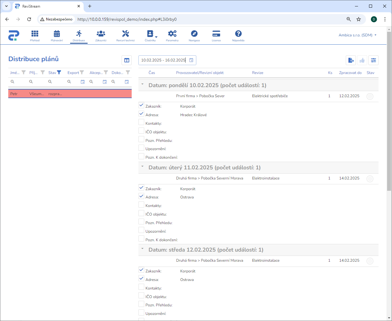 Připravte každému reviznímu technikovi týdenní plán práce s veškerými jemu přiřazenými revizními úkony